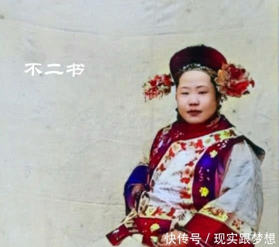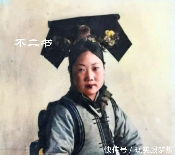 照片拍摄于清末时期,一名戴着旗头的女性在镜头前,和现在很多清宫剧不一样,清宫剧中为了表现唯美,哪怕是寻常的宫女一般的穿戴都非常华丽或者比较素白清新,然而真实的历史上,大部分都是暗色为主。