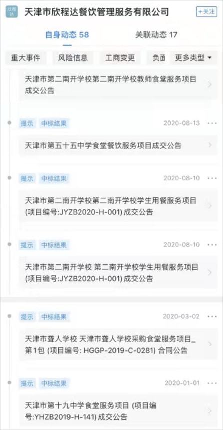 招投标信息显示,自2017年以来,天津市欣程达餐饮管理服务有限公司中标多家学校食堂用餐服务项目,包括天津市第十四中学、第十九中学、第二十中学、第二十一中学、第五十五中学,以及天津市汇文中学、天津市耀华中学、天津市第二南开学校、天津市汉阳道中学、天津市聋人学校、天津市视力障碍学校、天津港保税区空港学校机关及天津港保税区空港学校食堂等,中标金额最高达462万元。