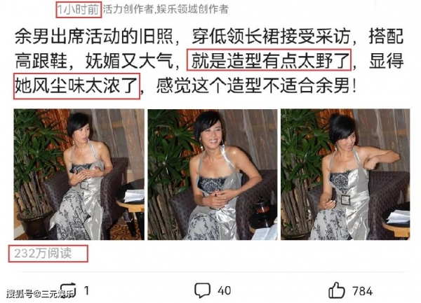 3月6日,有一位娱乐博主在网上晒出了一组余男出席活动的旧照,并配文“余男出席活动的旧照,穿低领长裙接受采访,搭配高跟鞋,妩媚又大气,就是造型有点太野了,显得她风尘味太浓了,感觉这个造型不适合余男!”短短1个小时,浏览量就超过了230万,该娱乐博主的言论引起了网友们热议,“这个造型适不适合余男?”成为了网友们热议的话题。
