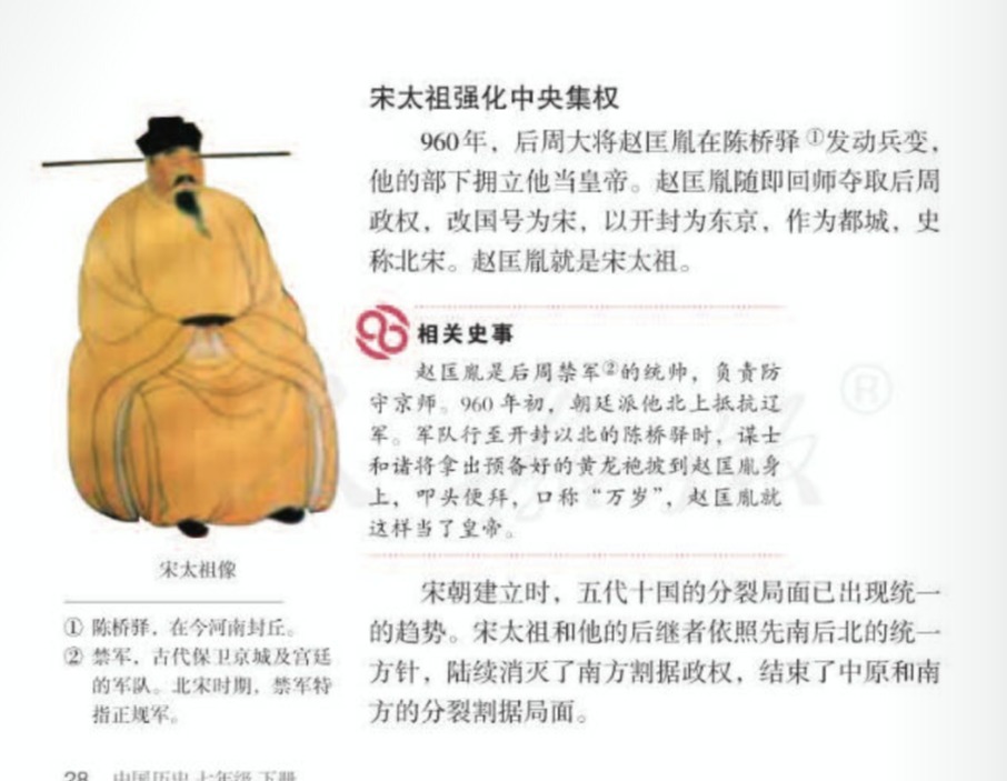公元960年初,朝廷派赵北上抗辽,军队行至开封北边不远的陈桥驿时,谋士和诸将拿出预备好的黄龙袍披到赵匡胤身上,叩头便拜,口称"万岁",赵匡胤就这样当了皇帝。