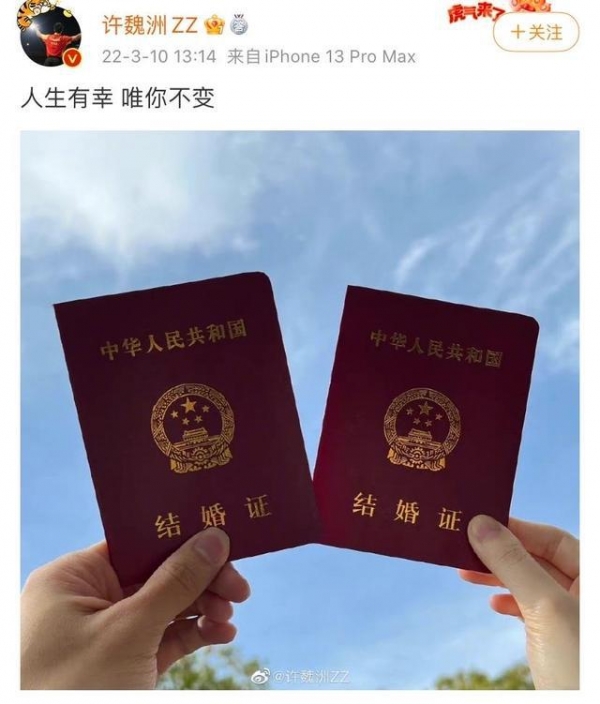 但美中不足的是,许魏洲在第一时间并没有公布老婆的正脸照,配图选用的是两人手持结婚证面向天空的照片。因此,对于许魏洲老婆的猜测便在社交平台中讨论起来。