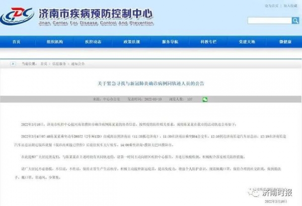 2022年3月10日,济南市疾控中心接河南省濮阳市确诊病例陈某某的协查信息,按照疫情防控相关要求,现将陈某某在我市的活动轨迹公布如下: