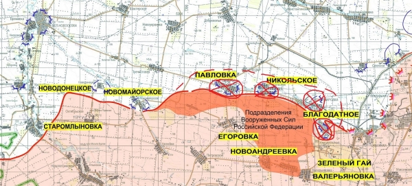 俄罗斯武装部队在顿涅茨克地区的作战中,夺控了帕夫洛夫卡、尼古拉斯科耶和弗拉迪米罗夫卡,控制了此前包围的布拉戈达诺耶。尽管今日俄国防部并未再发布该区域新的作战地图,但根据前一日发布的态势地图,结合13日简报中提到的情况,今天的行动中俄军已经切断了T0509公路,向更北的N15公路推进。