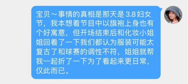 她表示很感谢大家的关心,但事情的真相并不是网上说的那样。事实上,事发当天是三八妇女节,她想有个好的寓意,所以穿着旗袍主持节目。
