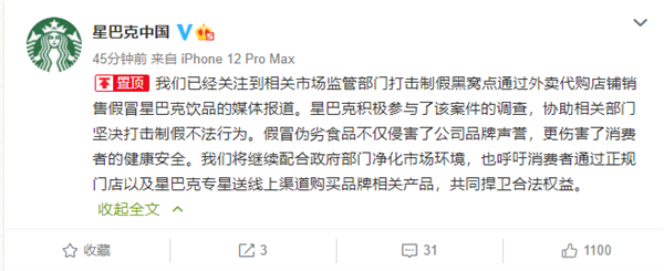 今天上午,@星巴克中国官方发布消息称:已经关注到相关市场监管部门打击制假黑窝点通过外卖代购店铺销售假冒星巴克饮品的媒体报道。星巴克积极参与了该案件的调查,协助相关部门坚决打击制假不法行为。