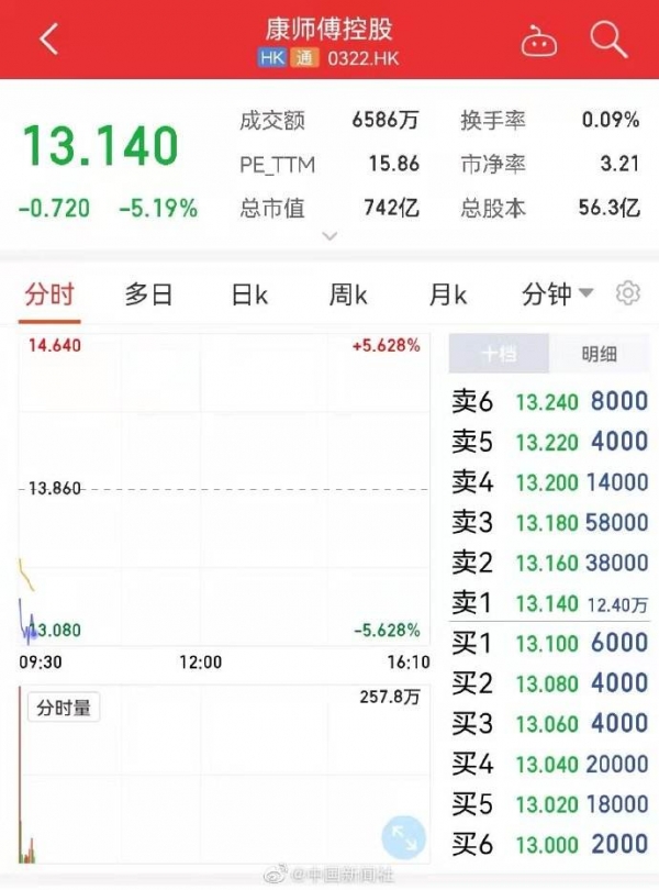 金融界3月16日消息 今日早盘,港股康师傅控股跌超14%,康师傅确认插旗菜业是供应商,已中止其供应商资格。统一企业中国跌超6%。