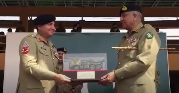 在SH-15服役仪式上的巴基斯坦陆军参谋长巴杰瓦上将(右)图源:视频截图