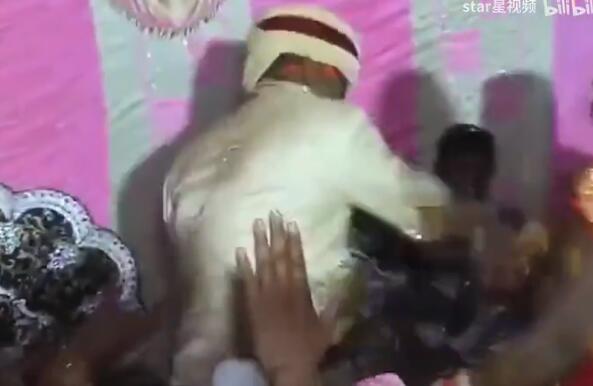 宾客们对新郎的反应感到震惊,一位客人试图平息局势,然而还有许多客人站在一边看。