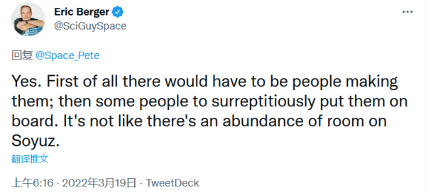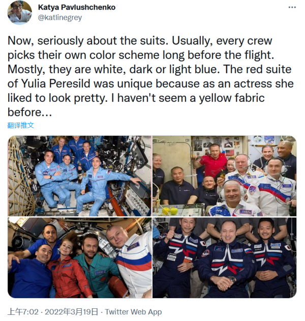 还有人继续跟着纽约时报的论调称,从没看过宇航员穿得这么鲜艳,这种时候穿黄色航天服必有深意,“通常,每个机组人员都会在出发前很早就选择了配色方案。大多数情况下,它们是白色、深蓝色或浅蓝色。我以前从来没有看到过黄色的。”