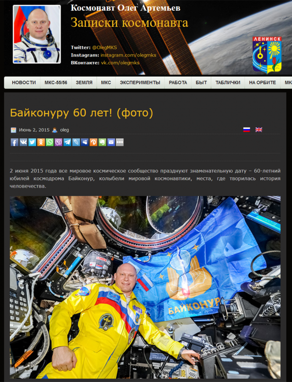 根据奥列格个人博客的内容,2015年6月2日庆祝拜科努尔航天发射场成立60周年时,他就穿着和这次制服非常相似的黄色航天服拍了张照片以示祝贺。