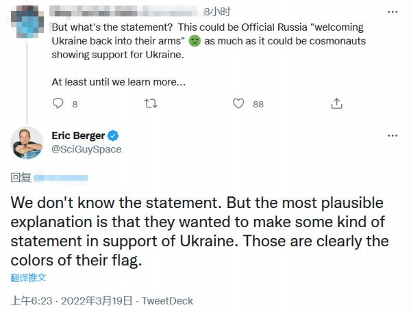 结果他就被上文曾提及的那位“资深编辑”埃里克给怼了回去:“我们也不知道他们想表达什么,但最合理的解释是,他们想发表某种声明支持乌克兰,这显然就是他们(乌克兰)国旗的颜色。”