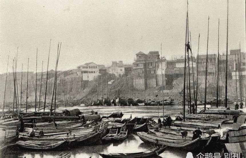 光绪二十四年老照片:汉口江上码头的船只已经好长时间不动了,远处的城市在雾茫茫的江边上若隐若现!