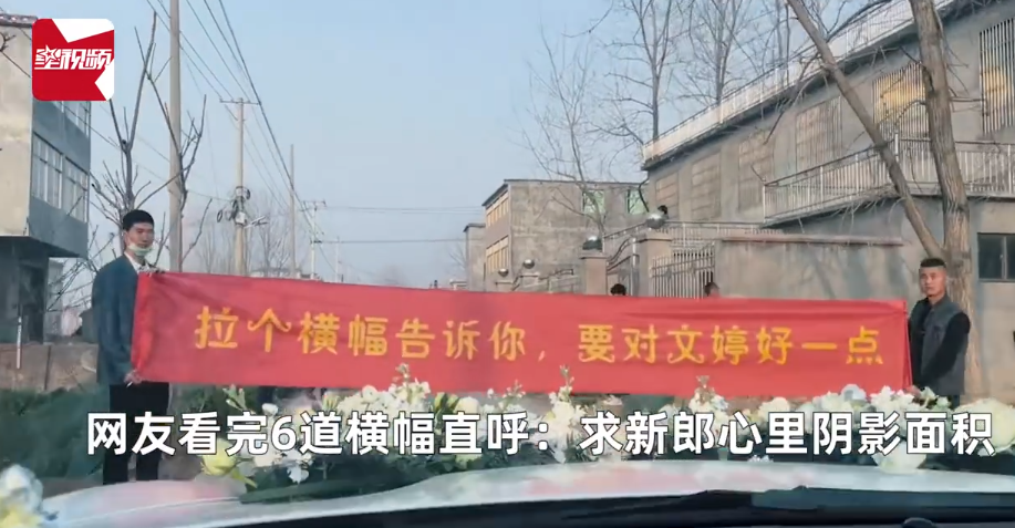 每道横幅上都写着对新郎的"警告语",网友看完6道横幅直呼:求新郎心里阴影面积。