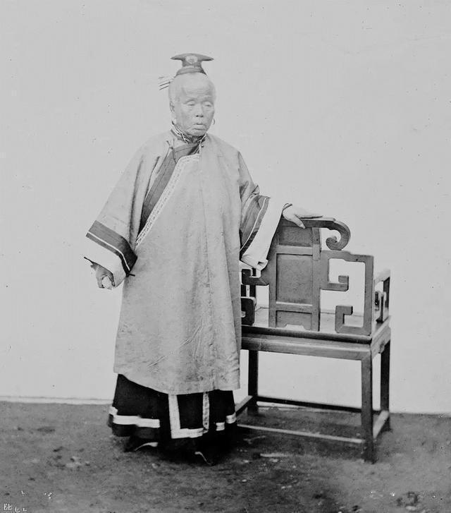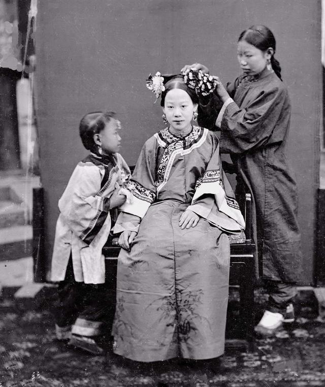 英国人拍摄的晚清妇女真实形象:一位大户人家的的夫人正坐着,佣人正帮她打扮。