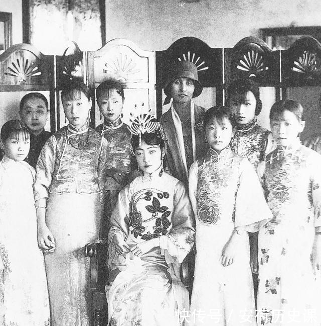 婉容在天津几年后,已经看着非常成熟了。她经常跟溥仪一起会见一些来宾,这照片是婉容和一些来宾等合影。