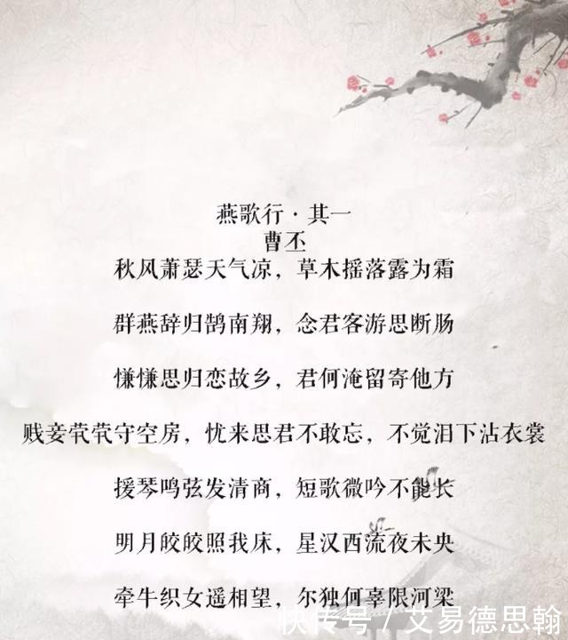 这首诗文采飞扬且不说,若是没有曹丕这首《燕歌行》,就没有南北朝时期鲍照、庾信,唐朝时期骆宾王、李白这些人的七言诗词了。除了这一首,曹丕的诗还有四十多首,叶嘉莹说,曹丕是一位"理性诗人",有节制有反省,"以感与韵胜"。诗才方面,历史不能缺了曹丕一席!
