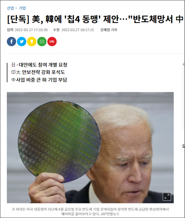 《亚洲日报》称,美国提出的"芯片四方联盟"(Chip 4)将对韩国政府和半导体企业造成沉重负担。中国大陆是无法忽视的全球最大半导体市场,韩国半导体企业也在中国大陆建有核心生产基地。