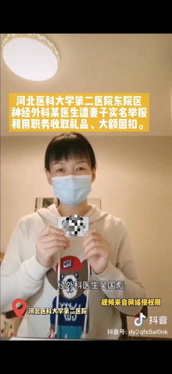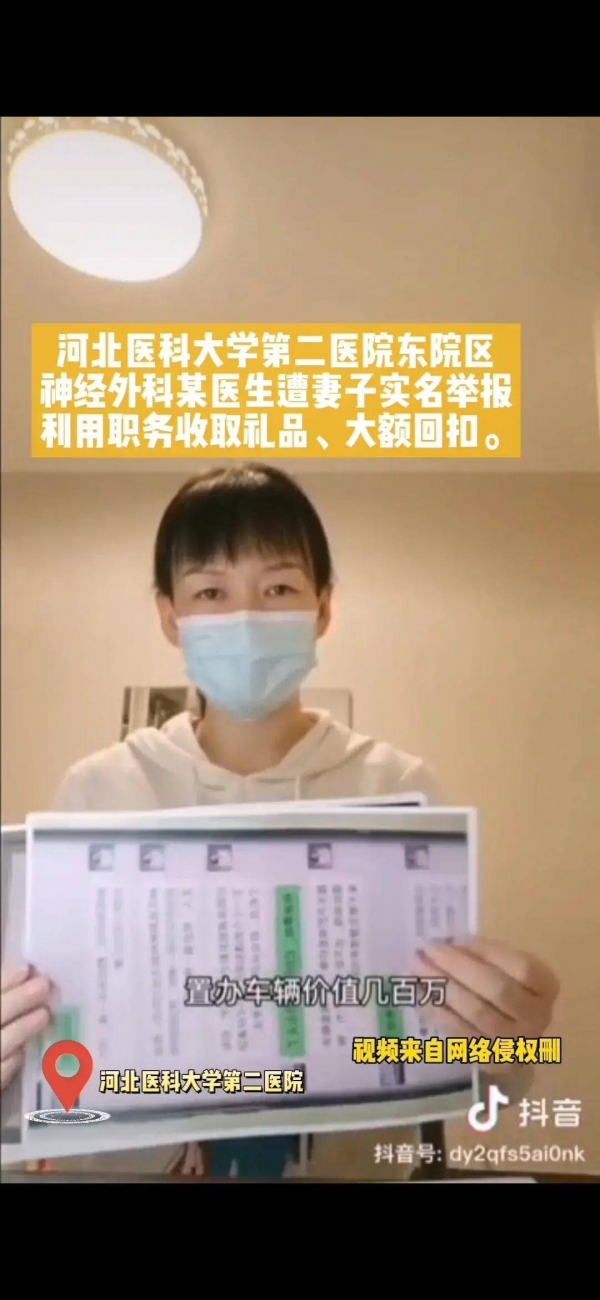 网友实名举报自己的丈夫河北医科大学第二医院东院区神经外科某医生,利用职务收取礼品、拿大额回扣,打着省二院专家的旗号,