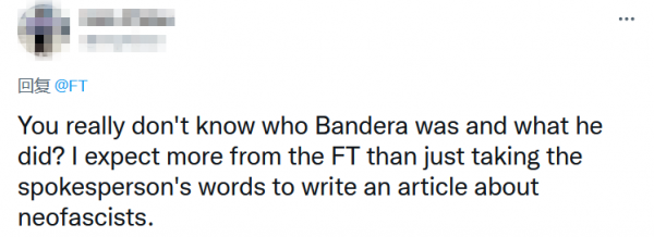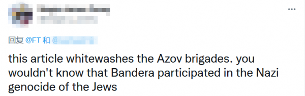 "这篇文章粉饰了亚速旅。你怕是不知道班德拉参与了纳粹对犹太人的种族灭绝"、"1945年,我们的祖父母和曾祖父母为抗击纳粹的威胁献出了生命。今天,《金融时报》洗白了现代纳粹主义。"