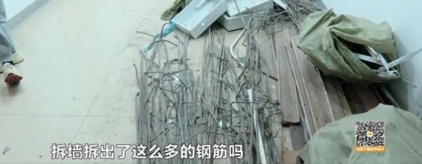 记者在美林美寓29楼的13户型前看到,13户型正在进行敲墙,明显可以看到墙里是有钢筋的,马上这块就会被敲下来。