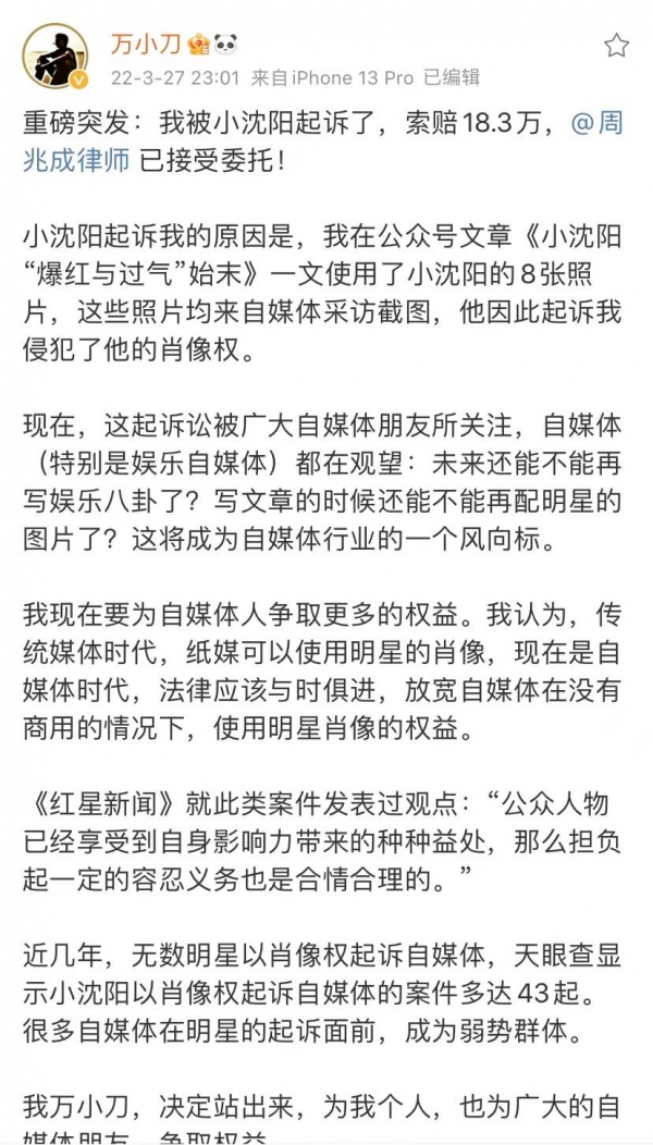 3月28日,自媒体人"万小刀"发文称,艺人小沈阳以"肖像权纠纷"为由起诉他,索赔18.3万元。