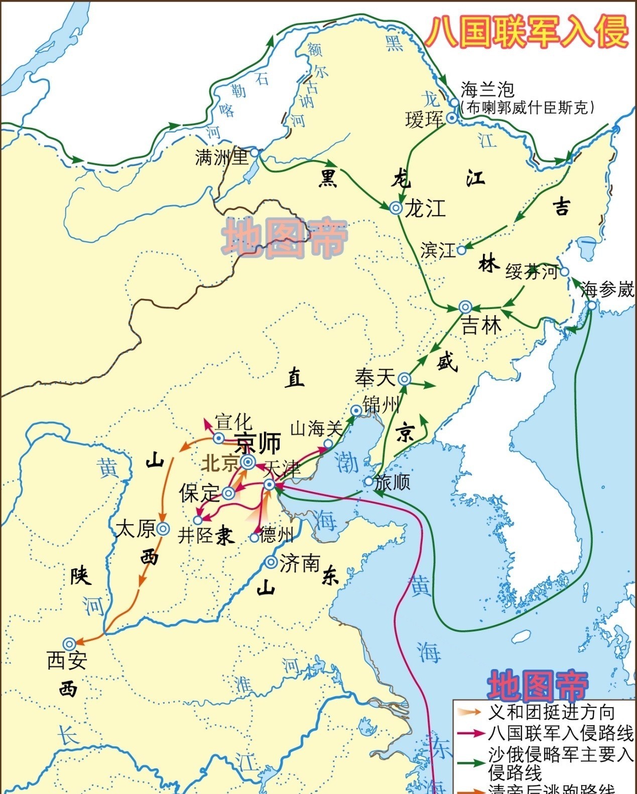 1900年以英、美、法、德、俄、日、意、奥为首的八个主要国家组队的对中国进行武装侵略,慈禧逃往西安。北京城沦陷,八国联军到处杀人放火、肆意抢掠!偷窃和抢掠的珍宝不计其数!万园之园"圆明园"继英法联军抢掠之后再遭浩劫,终成废墟。