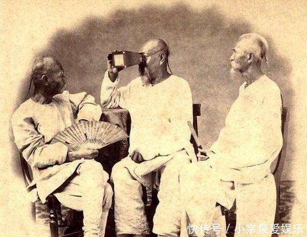 清朝人喜欢新鲜的东西,图中三个清朝老人坐在一起玩耍,中间的老人拿着一个类似望远镜的东西在观看,旁边的两个老人各自拿着扇子很是好奇的看着拿望眼镜老人!