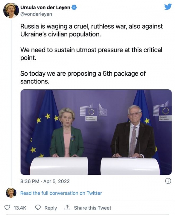 可以说,波兰这是在让欧盟难堪,因为欧盟还尚未决定采取这样的措施。结果,直到4月6日,才传出消息说,欧盟将对俄追加"第5轮制裁",其中就包括实施煤炭禁运、禁止俄货轮进入欧盟港口。欧委会主席冯德莱恩介绍,欧盟还在筹划禁止从俄罗斯进口石油。
