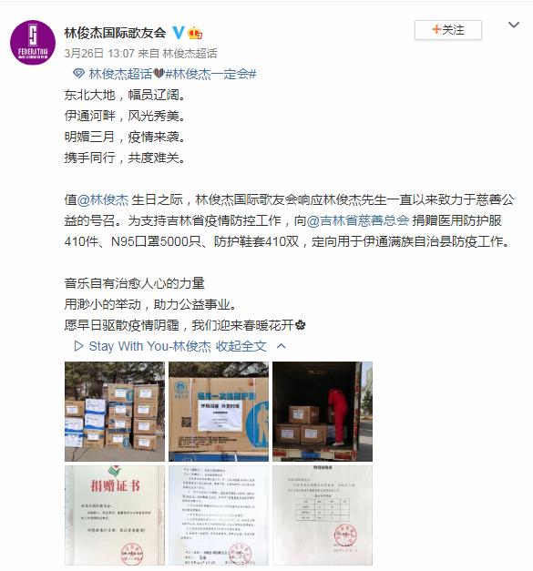 林俊杰是公认的实力派歌手,出道多年的他给大家带来的经典歌曲数不胜数。与此同时,林俊杰还是实打实的公益人。在疫情期间,JJ国际歌友会响应林俊杰一直以来致力于慈善公益的号召,曾向吉林省慈善总会捐赠了医用防护服、N95口罩、防护鞋套,定向用于伊通满族自治县防疫工作。如此有爱心,的确是正能量爆棚。最后,希望JJ在家一定要注意身体,继续保持好心态,早点恢复健康,康复后再给大家带来动听的歌曲。