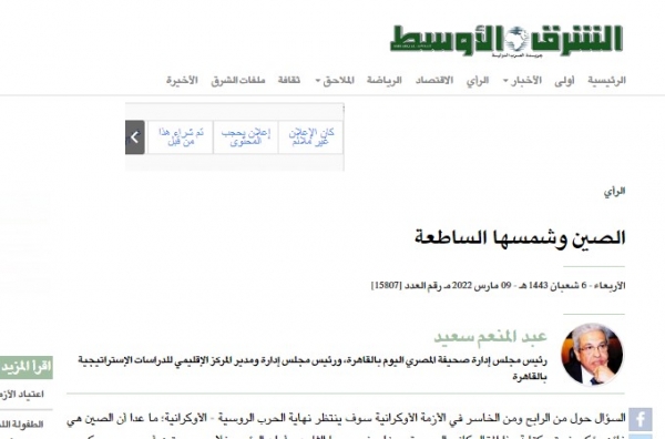 第二天,埃及资深权威报人阿卜杜·马纳姆·赛义德就在《中东报》上发表了《中国和她的光辉太阳》,用标题传播中国自居世界的太阳一说。文中认为,中国已经摆脱了"战略潜伏期"(指从1949年到最近),但是"中央王国"只会采用让她舒适的方式行事,乌克兰危机中,卷入的各方都无力达成本方的意愿,"而中国独自站立在所有这一切的中央,等待着世界向中央王国奔赴而来,并目睹一个适合二十一世纪的、别样的超级大国"。