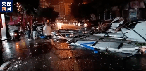 根据当地居民拍摄画面显示,局部风力较大,道路积水严重,部分车辆被淹,有居民家窗户被吹倒,房顶彩钢棚被吹下。