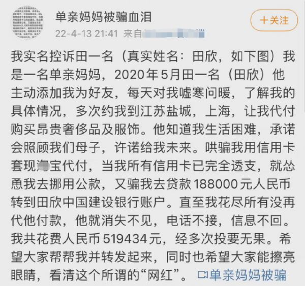 13日晚,一位名叫"单亲妈妈被骗血泪"的网友在网上实名举报,指出田一名的真名为田欣,而她是一位单亲妈妈。通过男方主动添加好友,两人在2020年相识。