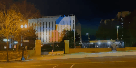 (观察者网讯)据美媒《国会山报》当地时间4月15日报道,13日晚,俄罗斯驻美国华盛顿大使馆的外墙上发生"灯光激战",反俄活动人士将两面乌克兰国旗投影到俄罗斯大使馆的外墙上,俄罗斯使馆工作人员则用明亮的聚光灯进行反击。