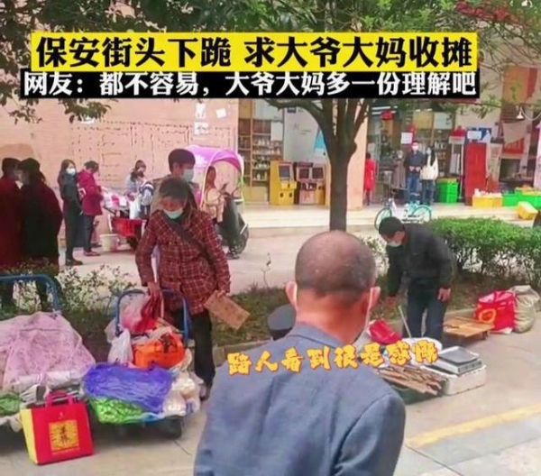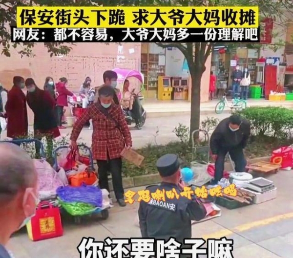 路人看到保安下跪的姿势,心中也是疑惑不解,没见过有保安向小贩下跪的,认为他这是在小题大做。