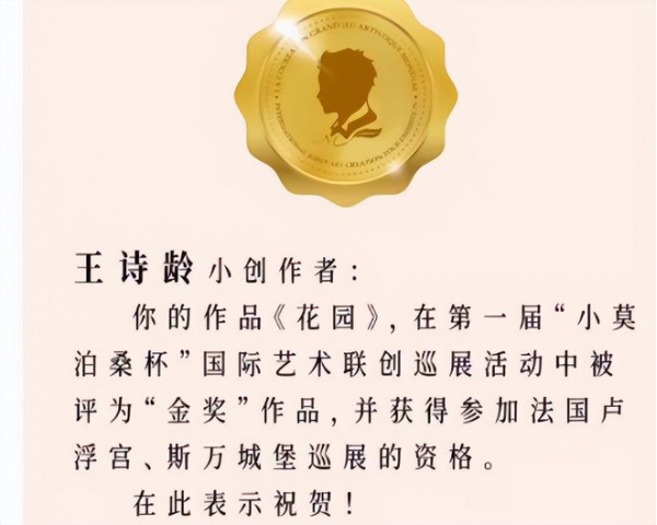 在父亲分享的喜悦信息之中,上面清楚地写着这是一次金奖的作品,并且获得了法国卢浮宫和斯万城堡的巡展资格,在此表示祝贺。