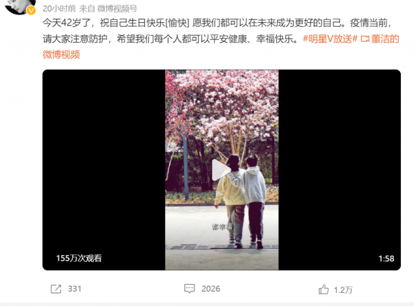 董洁在社交平台发了一段视频,并且配文道:"今天42岁了,祝自己生日快乐[愉快] 愿我们都可以在未来成为更好的自己。疫情当前,请大家注意防护,希望我们每个人都可以平安健康、幸福快乐。"