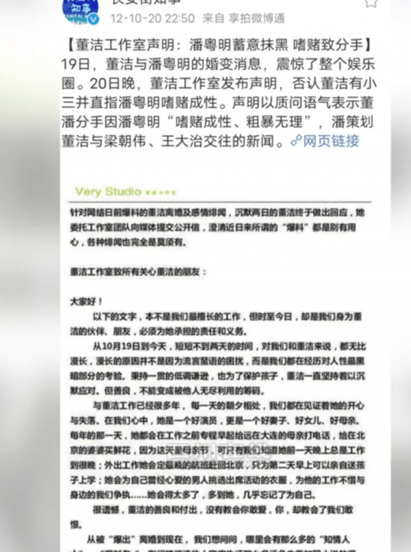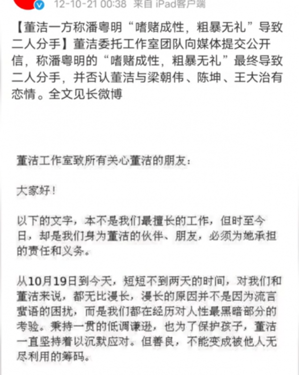 在2012年的时候,董洁和潘粤明两个人就传出了离婚的消息,这件事在当时闹得沸沸扬扬的,大家都把矛头指向了潘粤明,认为董洁是受害的那一方。董洁工作室在社交平台发文否认了出轨传闻,并且爆料称:潘粤明嗜赌成性,粗暴无礼,因此二人才分手的。