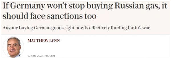 值得一提的是,就在英国政府宣布向俄罗斯天然气工业银行发放付款许可证前几天,当地时间4月19日,英国《每日电讯报》刚刚才发表评论文章声称,"如果德国不停止购买俄罗斯天然气,它也应该面临制裁。"