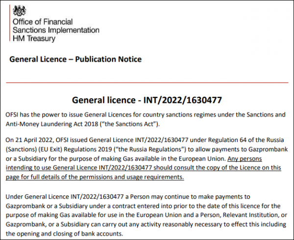 【文/观察者网 熊超然】据路透社当地时间4月22日报道,英国财政部21日发布的一份文件显示,英国已发放付款许可证,授权向受到西方制裁的俄罗斯天然气工业银行(Gazprombank)及其子公司支付俄天然气款项,期限到今年5月31日为止,以确保向欧盟供应天然气。