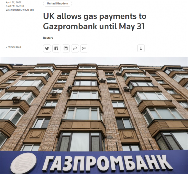 路透社介绍称,俄罗斯天然气工业银行是用于向俄罗斯支付石油和天然气款项的主要渠道之一,在此次俄乌冲突发生后,是受到英国制裁的俄罗斯实体之一。