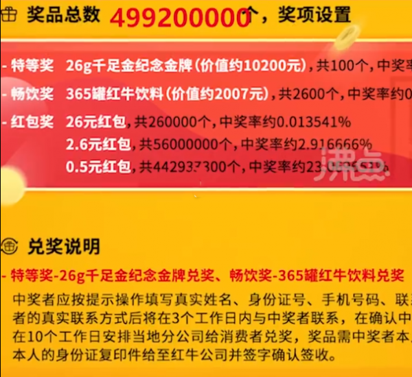 在该男子联系活动方之后,红牛官方也站出来解释这件事,根据红牛官方公布的奖项设定,今年红牛并没有送汽车的活动,从奖项设定中可以看到今年红牛最大的奖项就是特等奖"26g千足金纪念金牌",这个奖项价值约10200元,并且只有100个,这就非常奇怪了,那该男子中奖奔驰的红牛到底是怎么回事呢?