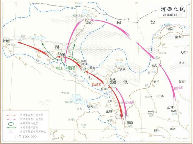 自此,汉武帝收复了全部河西走廊地区,并在那里设置了武威、酒泉、张掖、敦煌四郡。尤其是在此战前后的公元前138年、前119年,汉武帝先后两次派遣张骞出使西域,主动联合月氏、大宛等西域国家,争取抗击匈奴的后援力量。