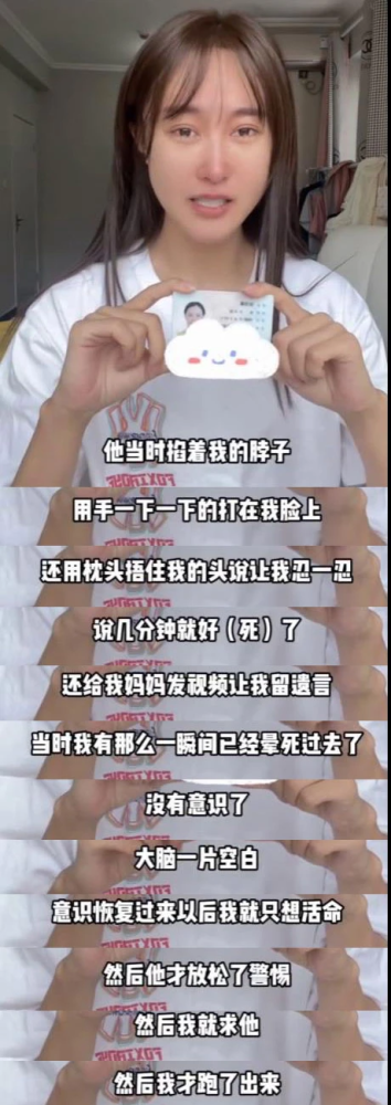 视频中,徐大宝素颜出镜,满脸泪痕,手拿身份证以证身份,含泪控诉丈夫贾洪清的恶劣行径,徐大宝还在镜头面前陈述以往不堪回首的回忆,最大程度地还原丈夫对其实施家暴的过程。