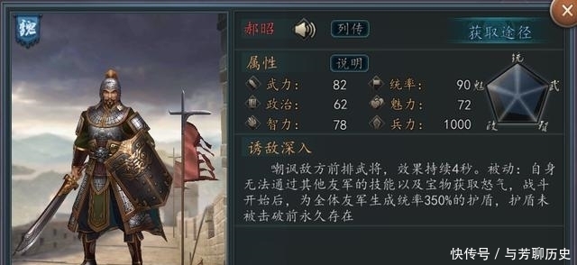 在三国志首款正版授权的手游《三国志2017》当中,智勇双全的郝昭拥有「诱敌深入」技能,可嘲讽敌方前排所有武将。并在战斗开始前为全体友军提供超高防护护盾。