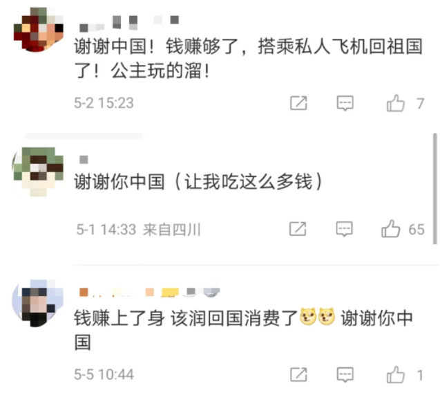 "谢谢中国!钱赚够了,搭乘私人飞机回祖国了,公主玩得溜。"