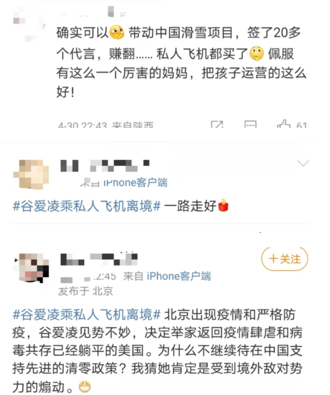 "北京出现疫情和严重防控,谷爱凌见势不妙,决定举家返回疫情肆虐和病毒共存已经躺平的美国。"