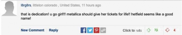 "这才叫致敬!你棒极了女孩!!Metallica应该给她终身免费的门票!Hetfield这名字听起来很不错!"