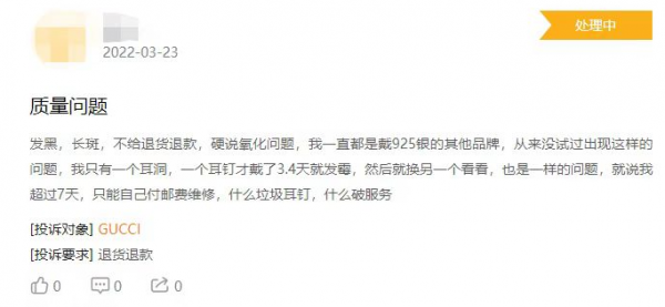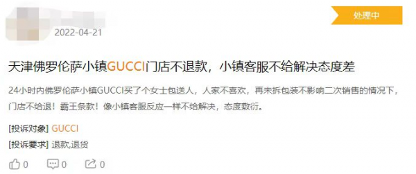 目前,在黑猫投诉平台上,关于Gucci的投诉涉及质量问题、客服态度等。