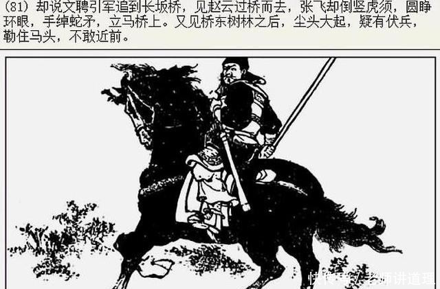 >张飞那里肯听,引二十余骑,至长阪桥。见桥东有一带树木,飞生一计,教所从二十余骑,都砍下树枝,拴在马尾上,在树林内往来驰骋,冲起尘土,以为疑兵。飞却亲自横矛立马于桥上,向西而望。