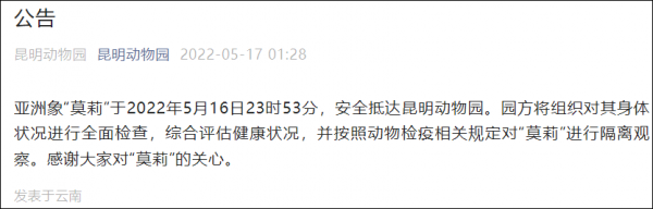 亚洲象"莫莉"于2022年5月16日23时53分,安全抵达昆明动物园。园方将组织对其身体状况进行全面检查,综合评估健康状况,并按照动物检疫相关规定对"莫莉"进行隔离观察。感谢大家对"莫莉"的关心。